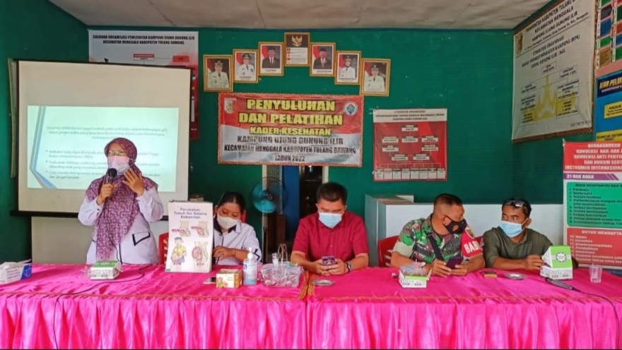 Materi disampaikan oleh Bidan Desa dan Tenaga Kesehatan Puskesmas Tiuh Toho Pelatihan dihadiri oleh Bidan Desa, Kader KPM, Kader Posyandu, Ibu hamil dan ibu yang memiliki balita, Pendamping Desa, Ketua BPK, Bhabinsa, Pj Kepala Kampung beserta Perangkat Kampung Ujung Gunung Ilir.